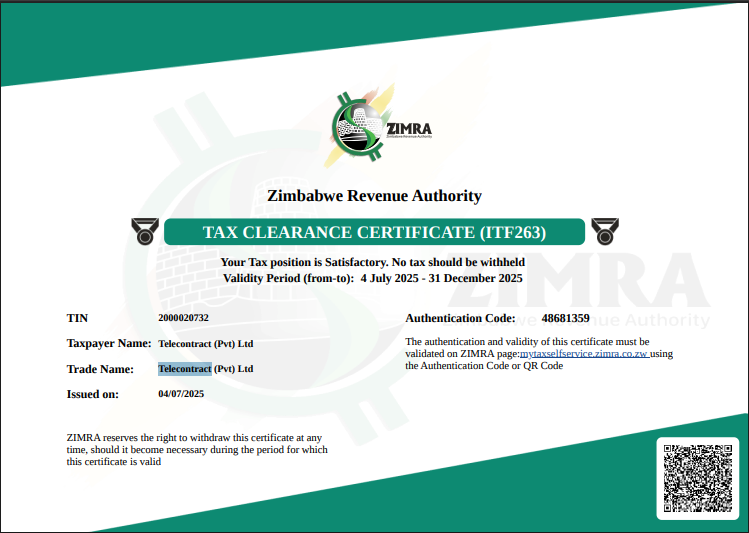 Telco (a division of Telecontract (Private) Limited) is fully compliant with all Zimbabwean tax regulations. We are pleased to provide access to our current Tax Clearance Certificate issued by the Zimbabwe Revenue Authority (ZIMRA).